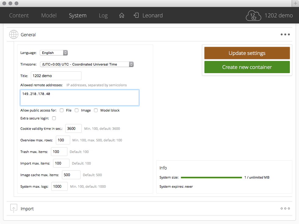 In order to allow access for the server on which our example site is running, add the server's IP address to the list of 'Allowed remote addresses' in the 'System' section of your 1202 system.