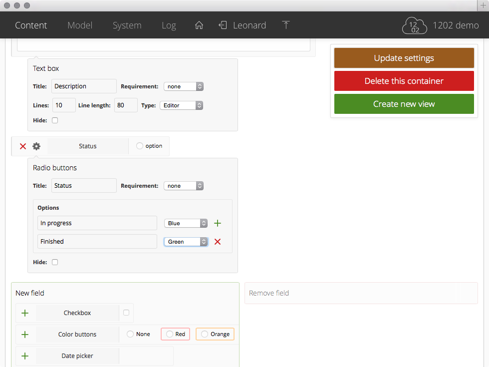 Our example site offers visitors information on projects, it has news articles, and a bit of 'generic' text about the company. Your 1202 system has a 'Text' container by default. This will suit our 'about' text because that only needs a title and some text. Projects and news, however, could have more properties, for instance a 'status' for projects, and a 'category' for news.