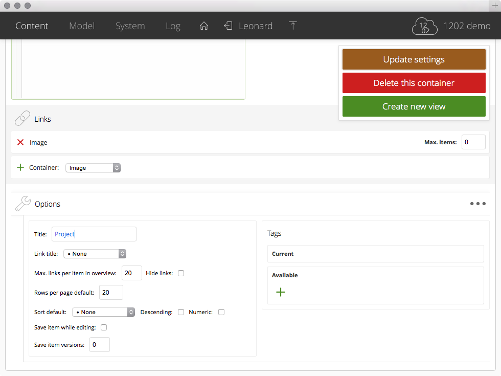 For our example site, we'll create views for the 'Text', 'Project' and 'News' containers. Go to each container and create a new view from the 'Settings' section.