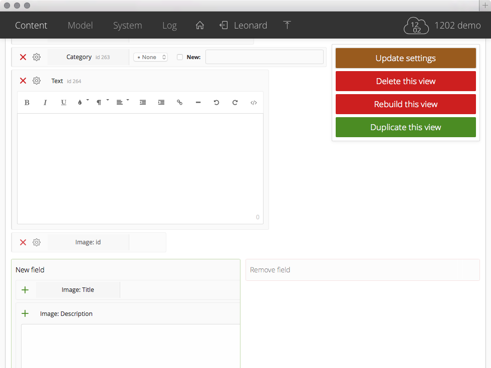 The source container or view determines the data available to the models. Because we want to use images on our site, at least their id's have to be provided by the view. This means we have to include them in the view fields.