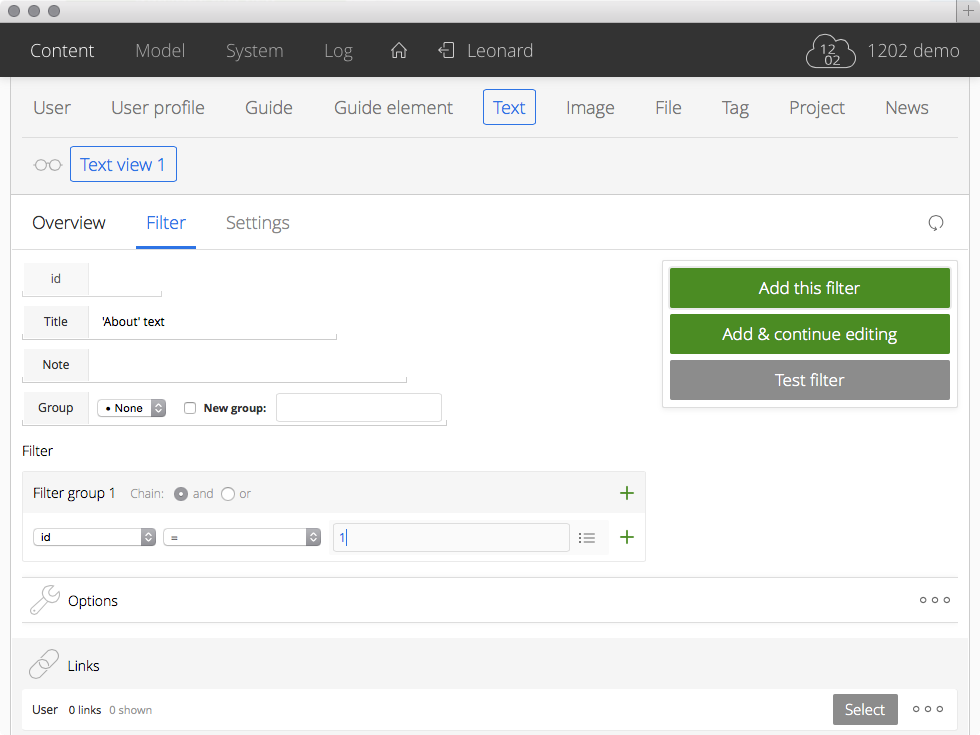Create a new filter by switching to the 'Filter' section of the 'Text view 1' view. Give it a 'Title' first, then move to the filter groups below. By default, the first filter element is set to 'id contains'. Change this to 'id =' (equals) and add to it the 'id' of the dummy 'about' text you've created earlier. Click 'Add this filter' (top right) to save the filter.