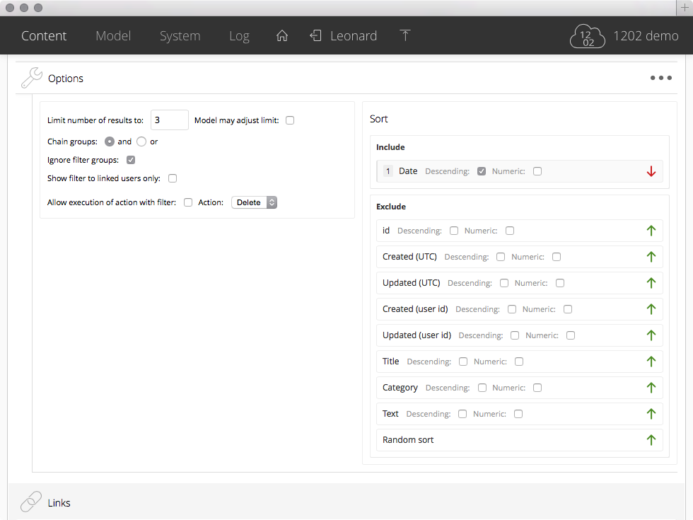Continue to the 'News view 1' view to add two similar filters, one with all news items titled 'All news items' and one with the last three news items titled 'Last three news items'. An important difference between projects and news items is that we sort the news items by date. You can set the sort in the 'Options' pane (right half of the pane). Click the green 'arrow up' icon next to 'Date' to include this field in the sort. Now check the box next to 'Descending' to make sure the latest news will come first.