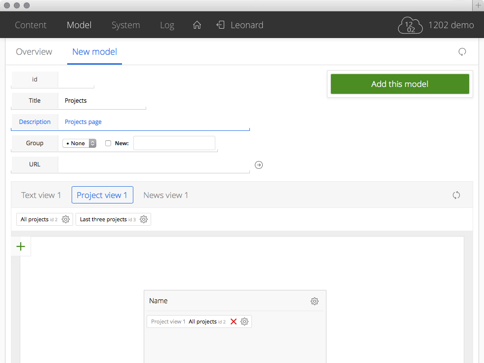 Click 'Add this model' to add the model and continue making another one. This one will be the 'News' model. Set it up in the same way as the 'Projects' model, of course with different values: