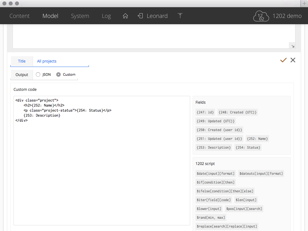 With no further settings, the model block will deliver data in JavaScript Serial Object Notation (JSON). This means your site retrieves all items in the 'Project' container as JavaScript objects, which you can use to process further. But it is also possible to make them more 'ready to use' by defining a custom output. To do this, click on the 'cog' icon of the model block (not the 'cog' icon of the attached filter) and select 'Custom' as 'Output' in the pane that folds out below.