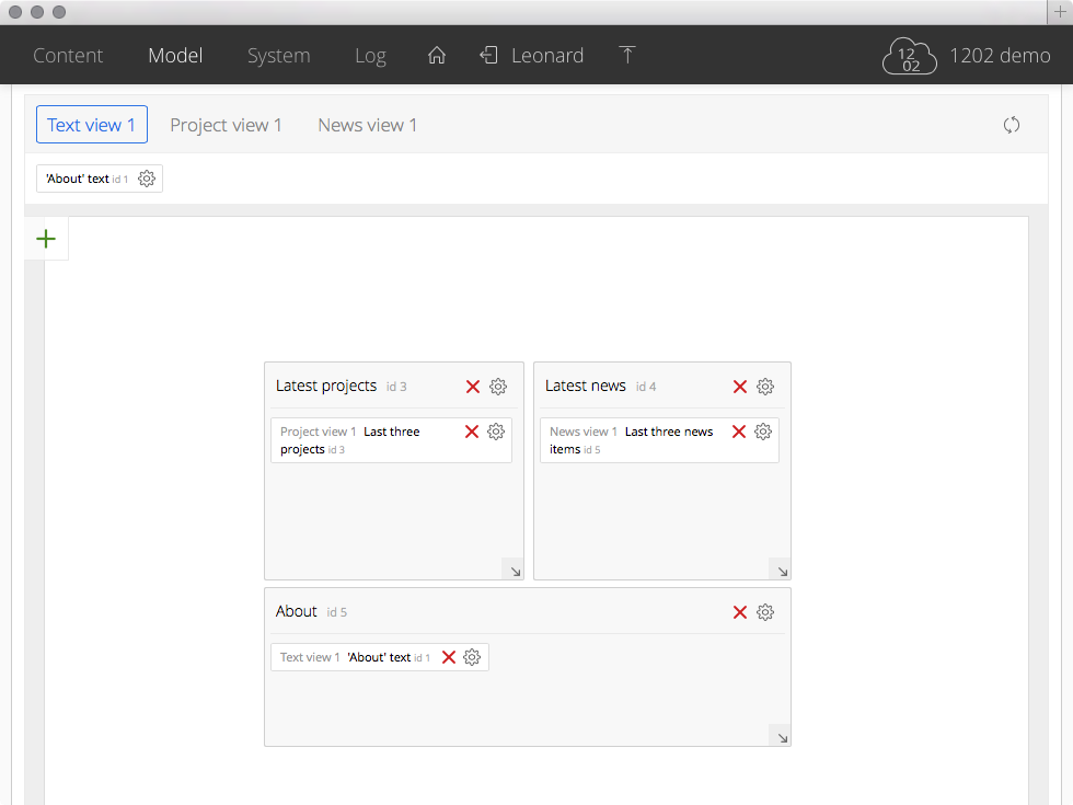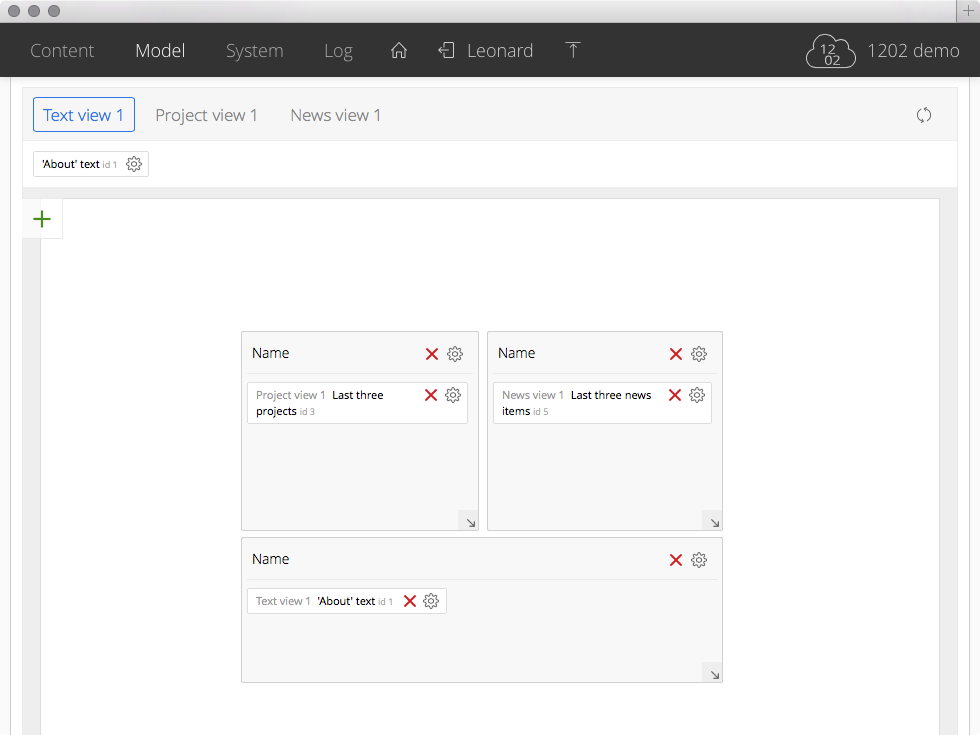 'Home' has not one, but three model blocks. One block outputs the 'About' text, the second one provides the last three projects, and the last one the last three news items. On our site, the 'About' text will sit below the last projects and last news, which are positioned next to each other (projects to the left, news to the right). We mimic this appearance in the model by dragging and resizing the blocks. Click on the 'plus' icon, left of the canvas, to create new blocks.