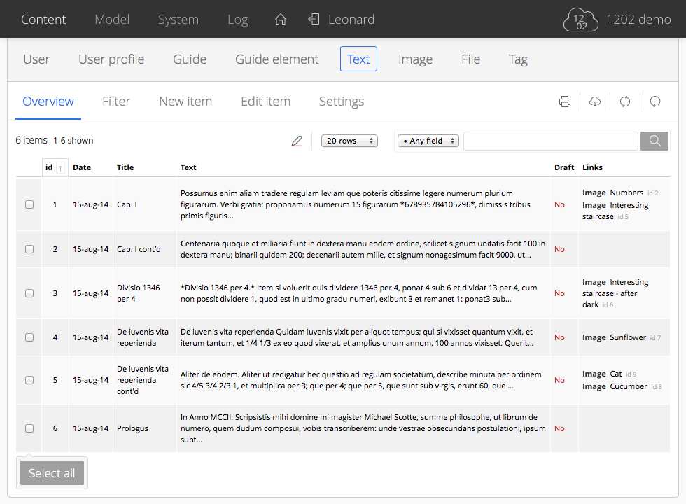 Overviews have a default setting for the listing of items. They can be changed in the 'Settings' section of a container/view. This default setting consists of a sort (column), rows per page and maximum number of links shown per item (or none at all).