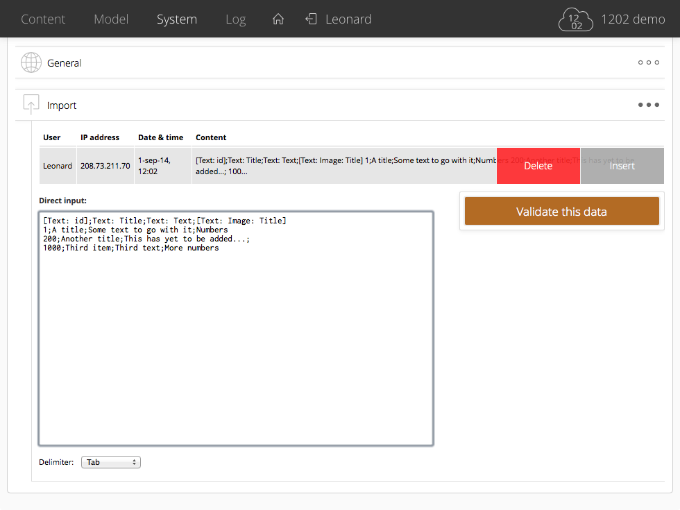 A very powerful asset of your 1202 system is the ability to import practically anything. In the 'Import' pane you can either import items by copying and pasting tabulated or semicolon/comma-separated data, using an uploaded CSV file, or inserting remotely submitted data.