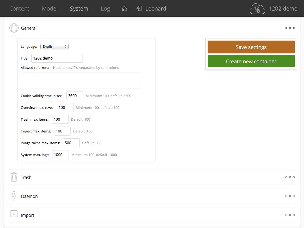 - Import max. items: your 1202 system can receive import data from a remote host. The 'Import max. items' setting prevents excessive amounts of stored imports. Defaults to '100'.
