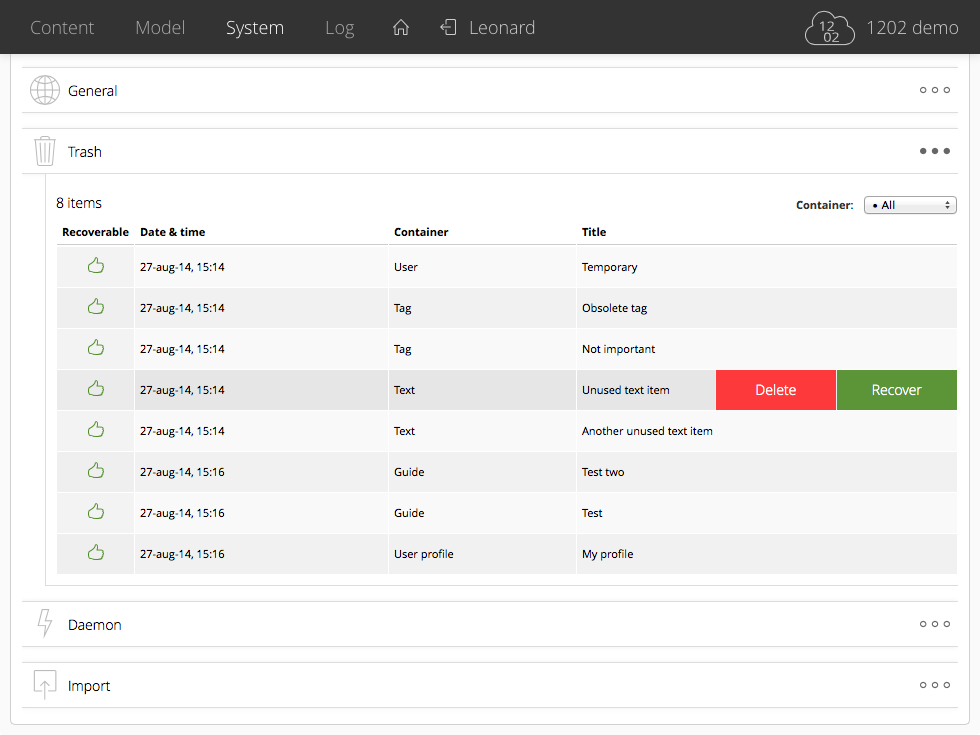 - Trash max. items: deleted items are collected as trash. The 'Trash max. items' setting limits the number of trashed items. When reaching this threshold, the oldest item will be deleted. Defaults to '100'.